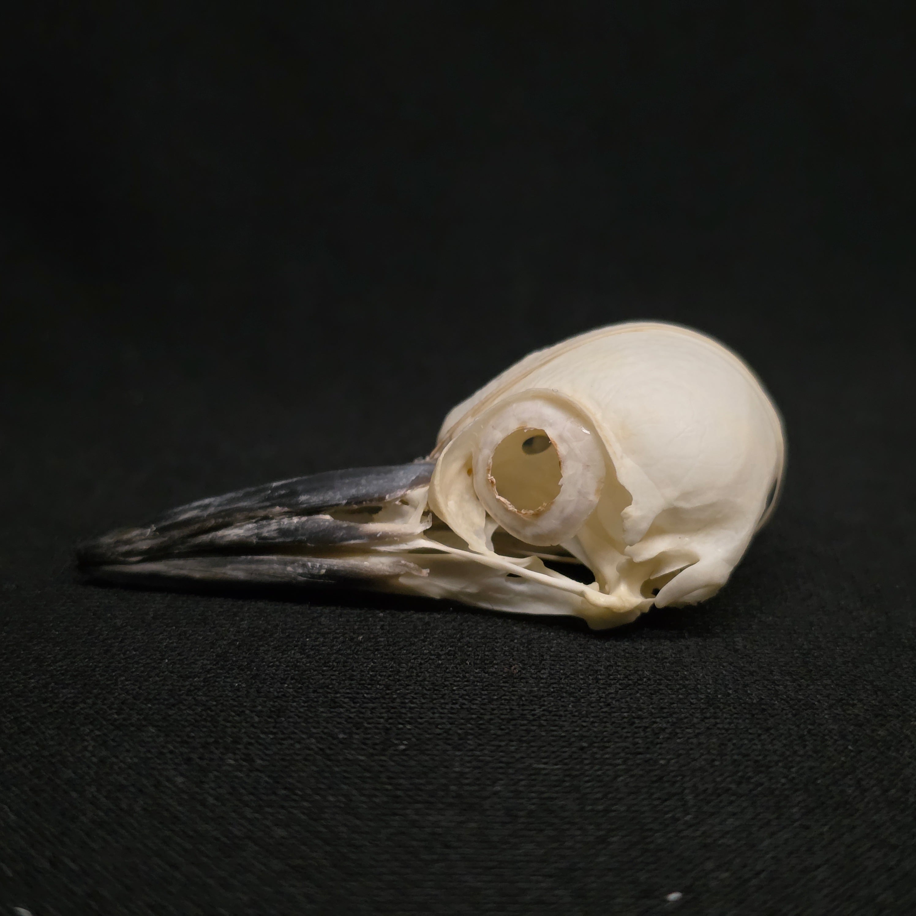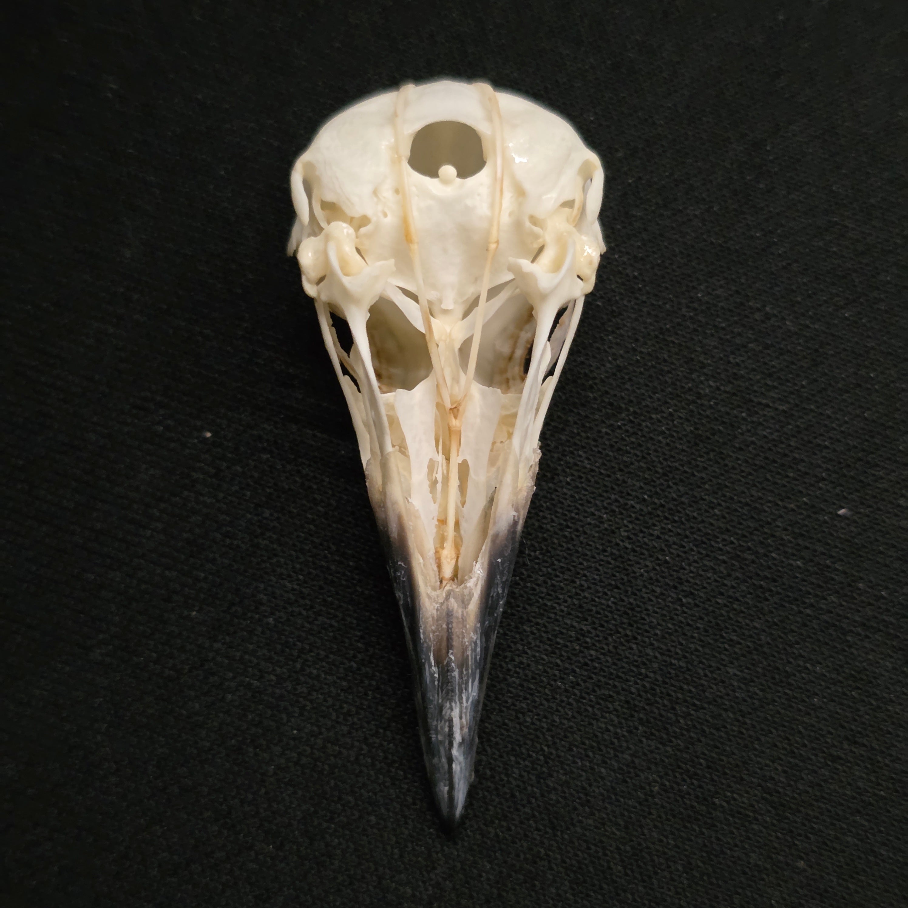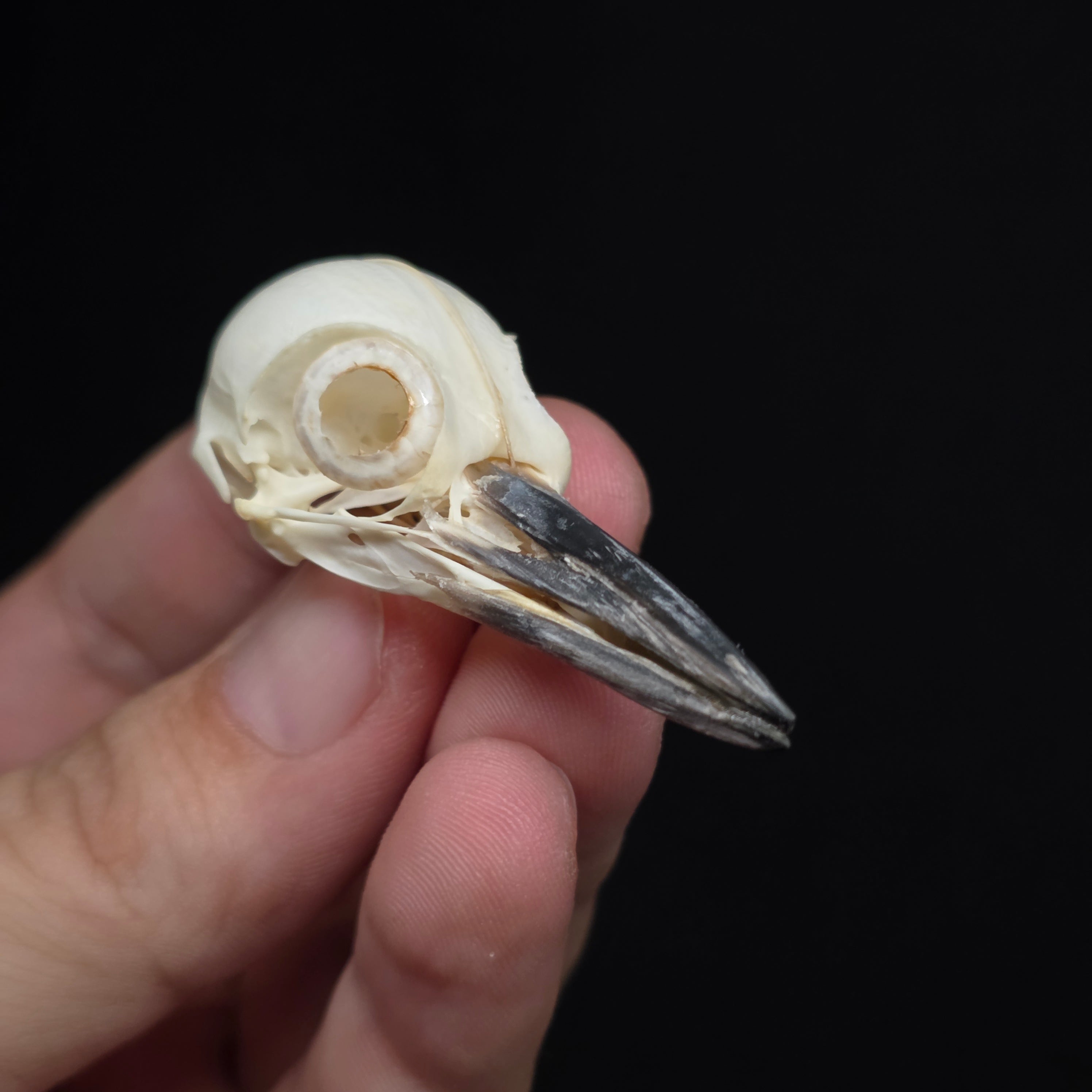A Great Spotted Woodpecker skull. A medium sized European Woodpecker species, this skull has the characteristic groove in the cranium where the tongue normally wraps around and sits, and even includes the actual tongues bones that wrap around from inside it's mouth, up the back of the skull and back towards the front.