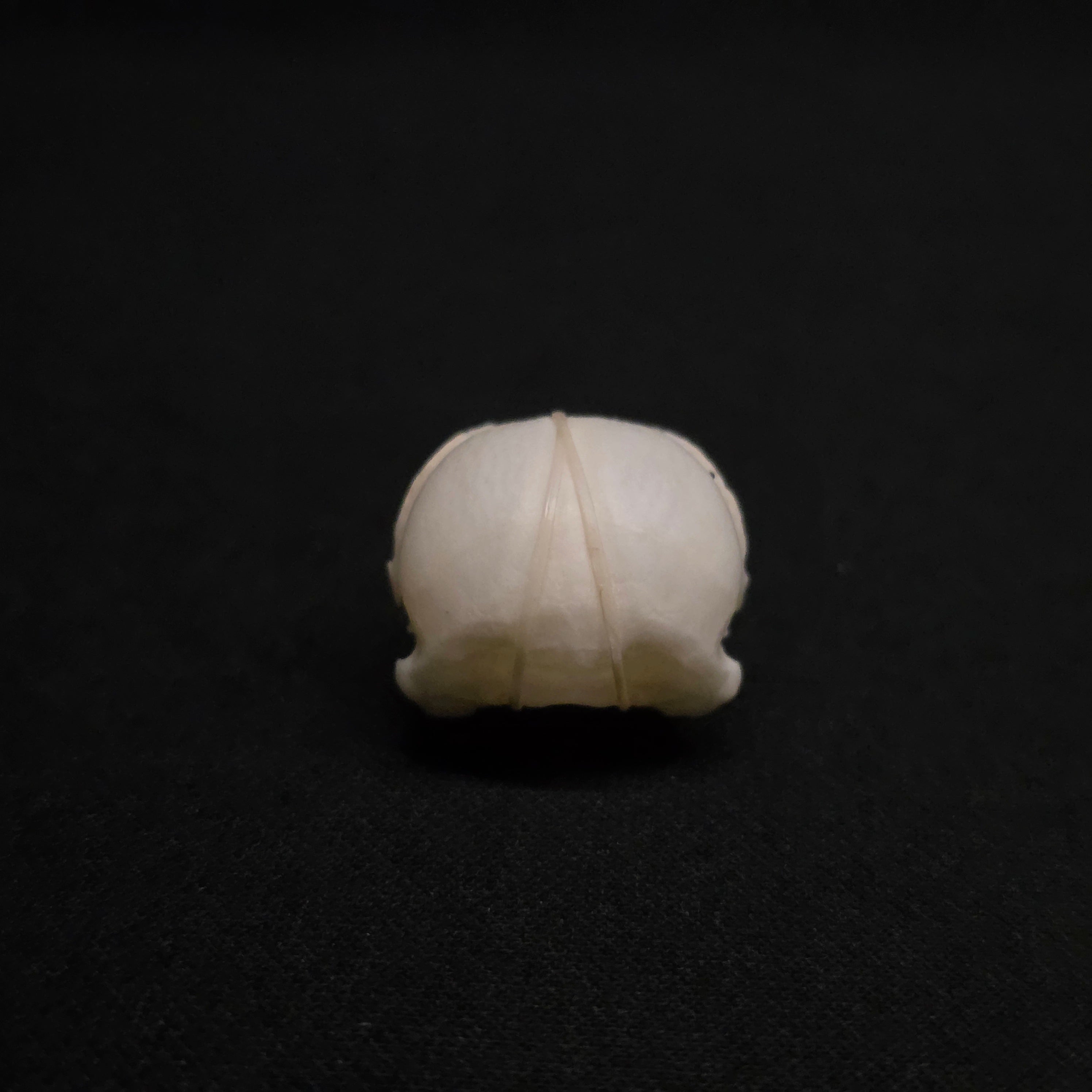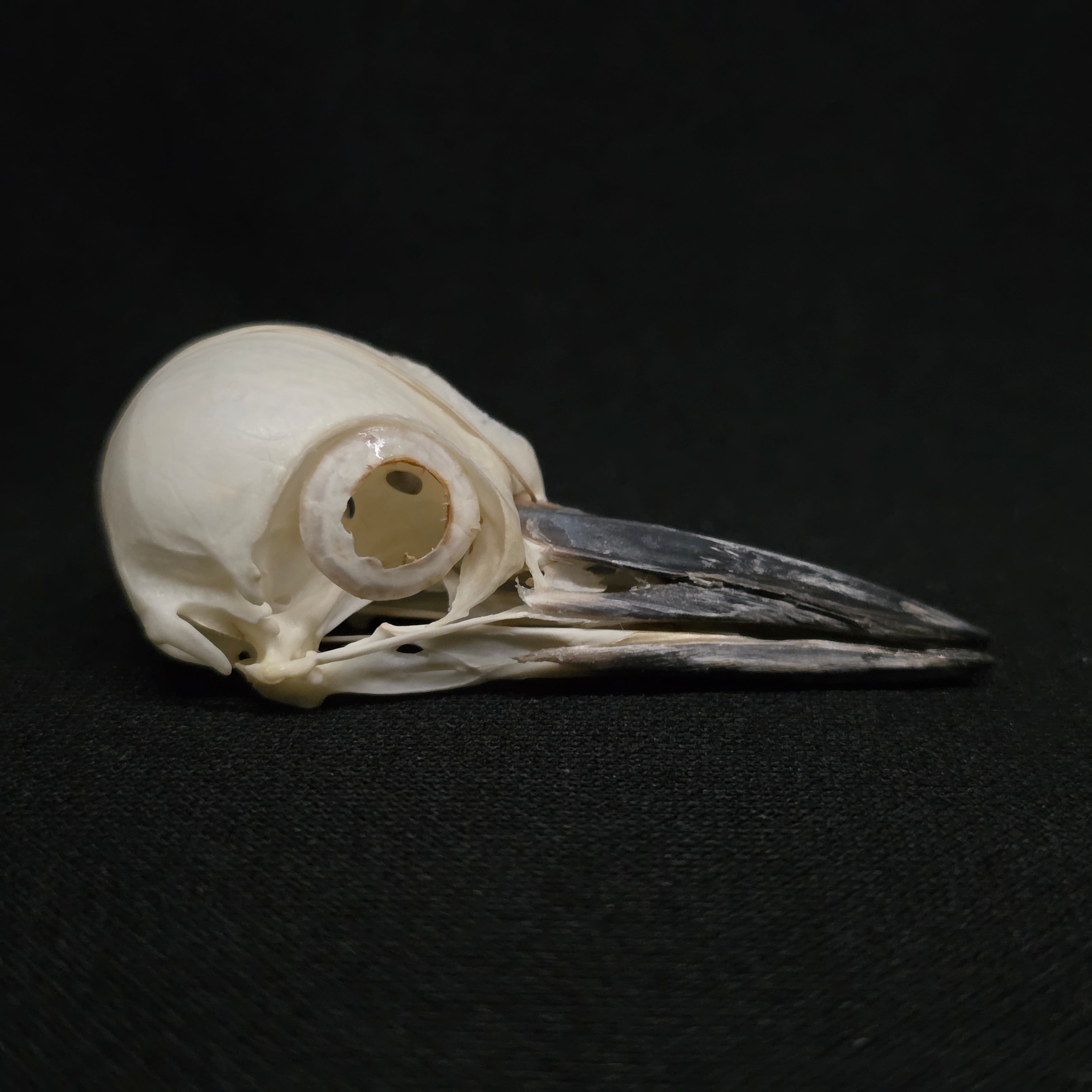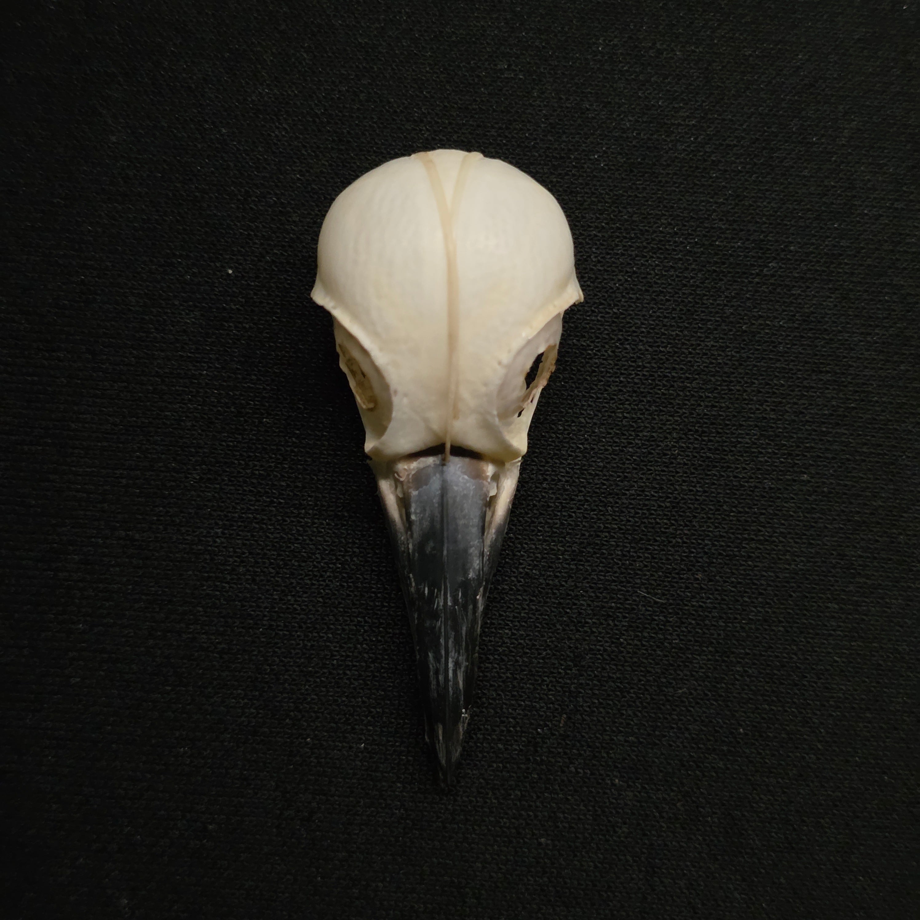 A Great Spotted Woodpecker skull. A medium sized European Woodpecker species, this skull has the characteristic groove in the cranium where the tongue normally wraps around and sits, and even includes the actual tongues bones that wrap around from inside it's mouth, up the back of the skull and back towards the front.