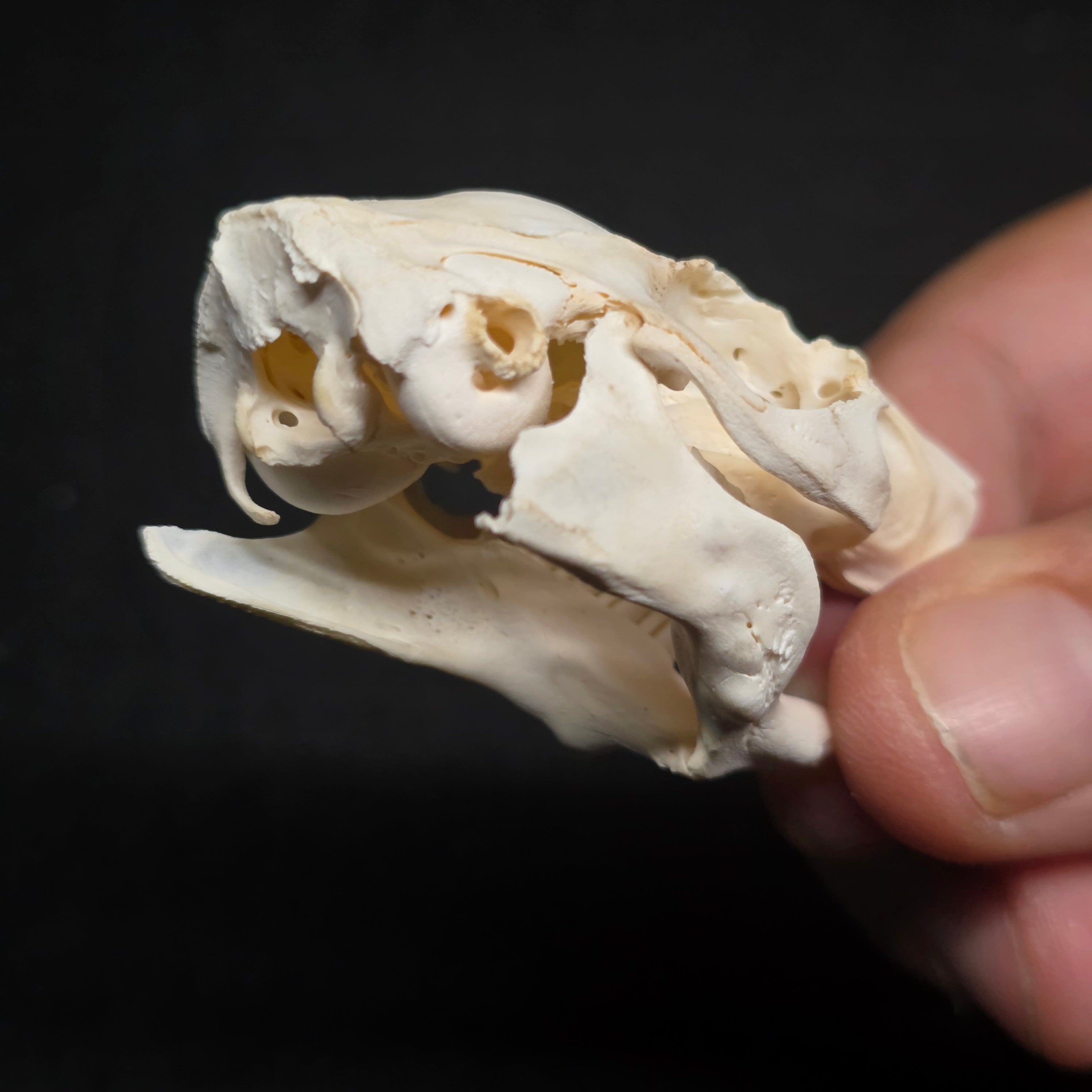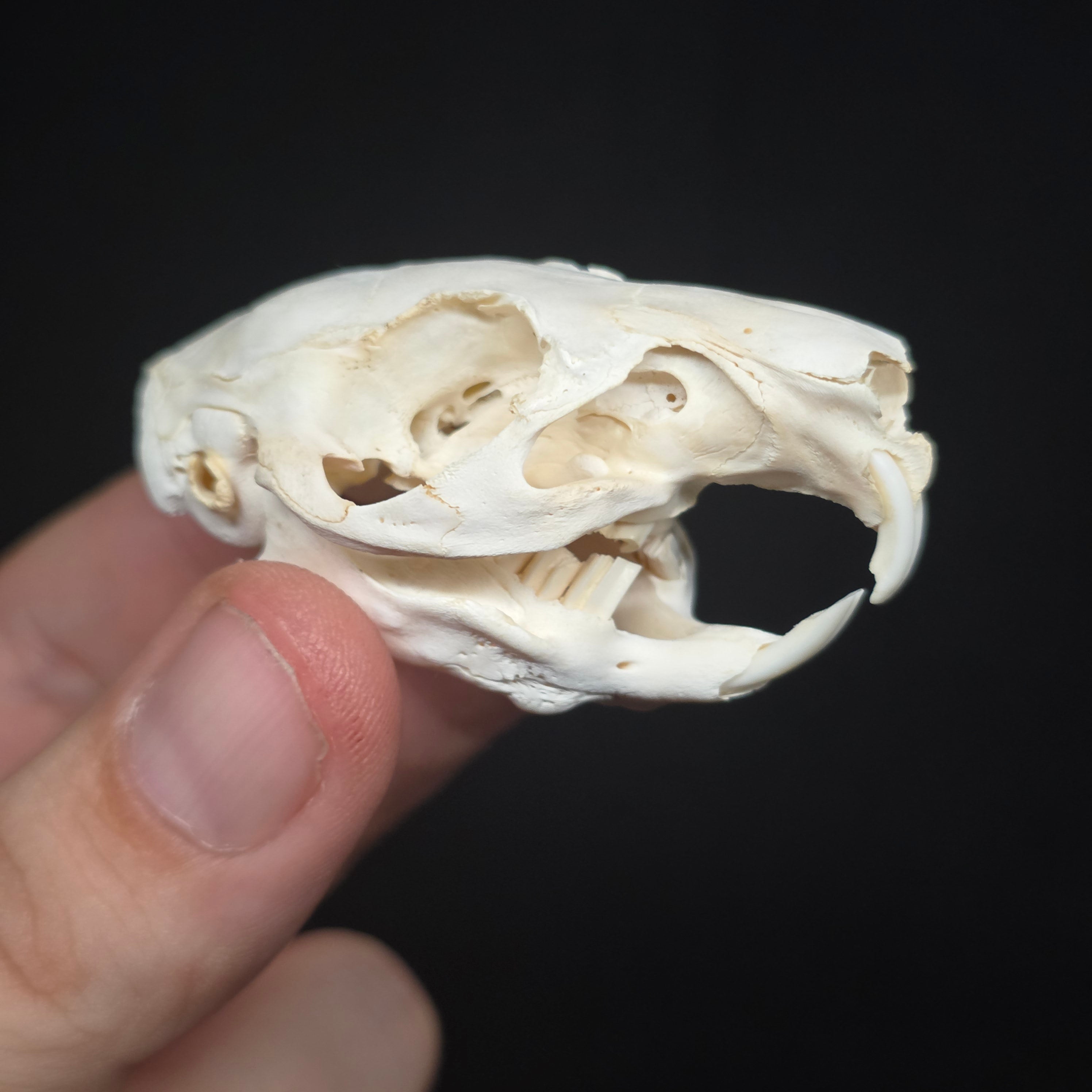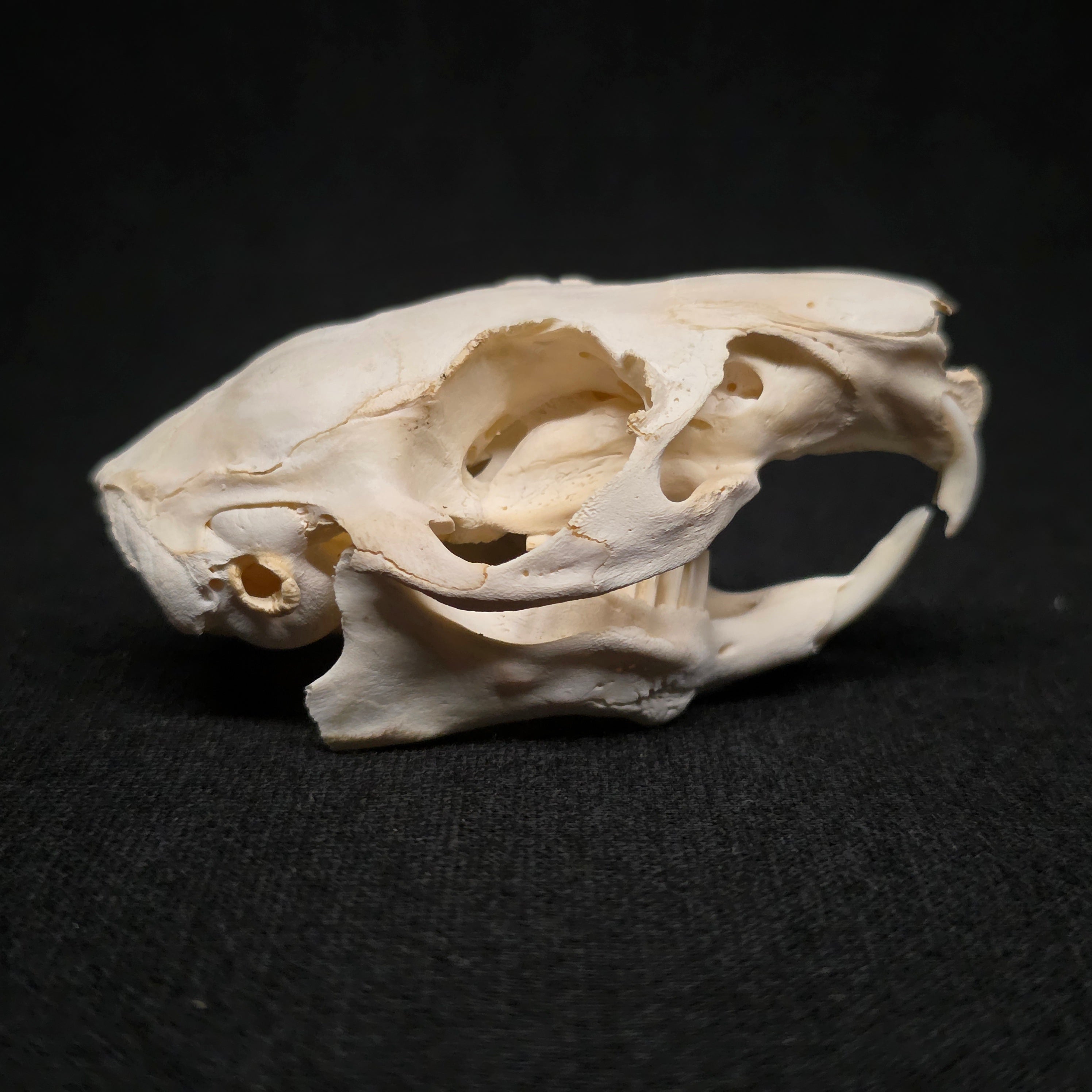 A nice big Guinea Pig skull. Has been degreased and whitened, and is complete with all teeth but has some damage to the right side of its lower mandible (see pics)