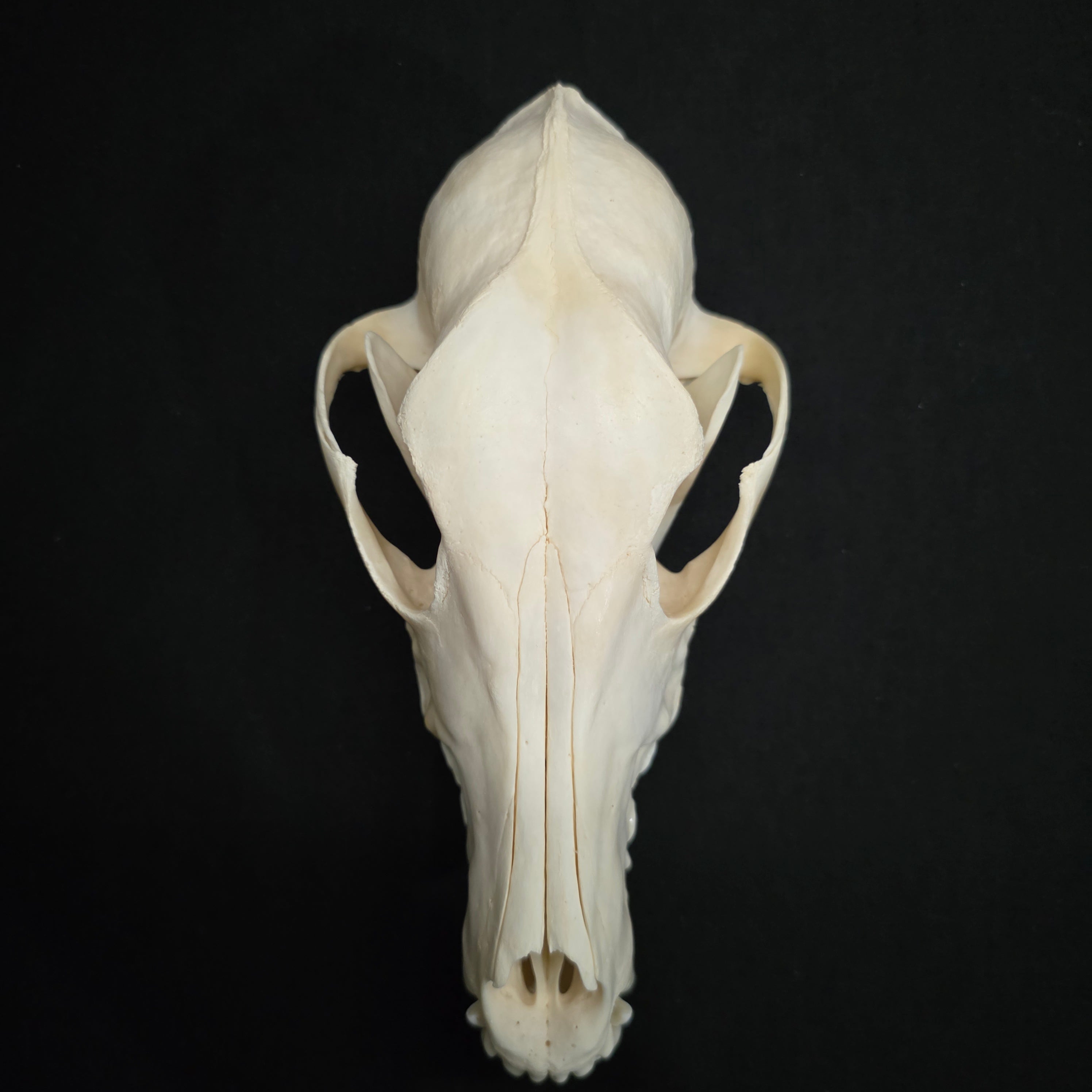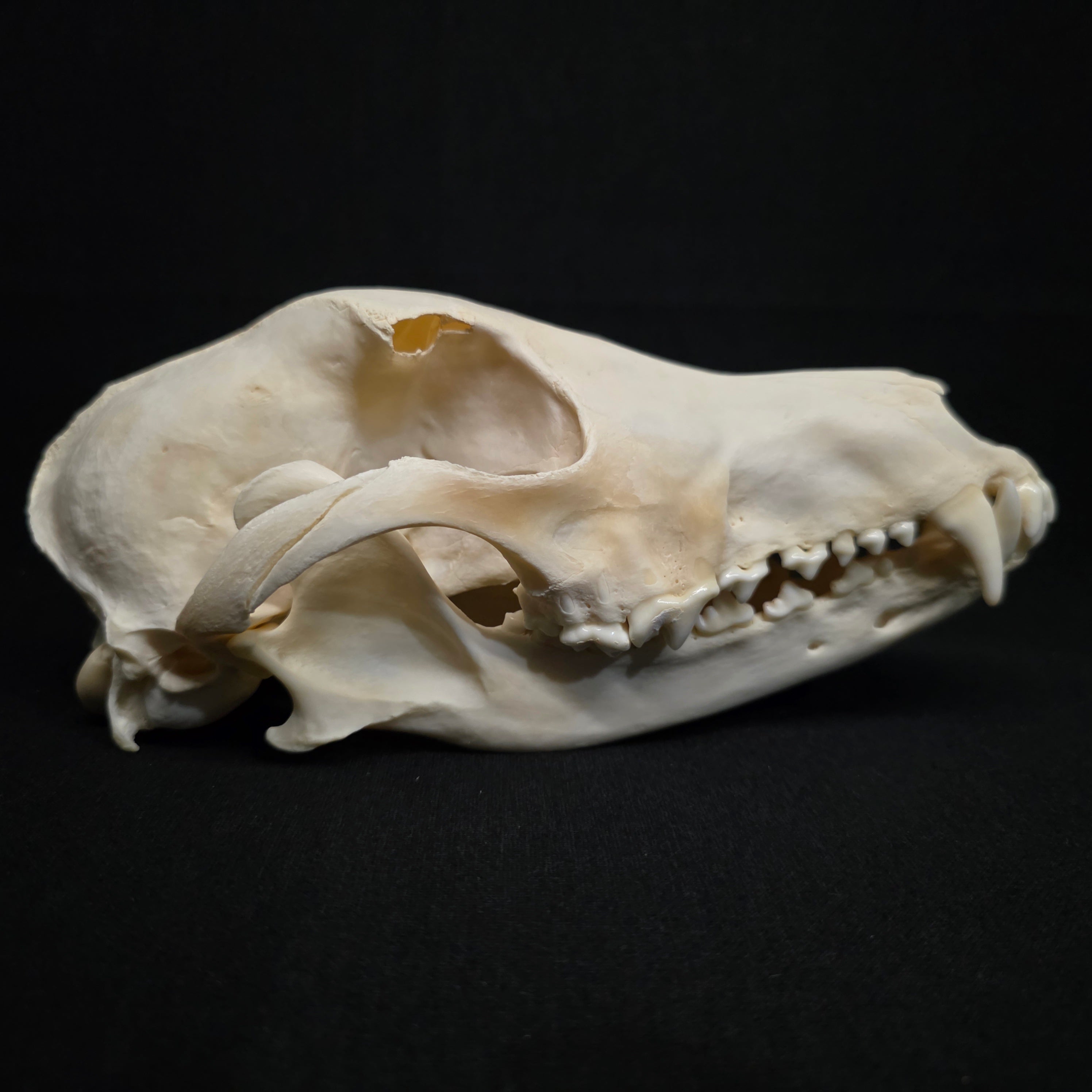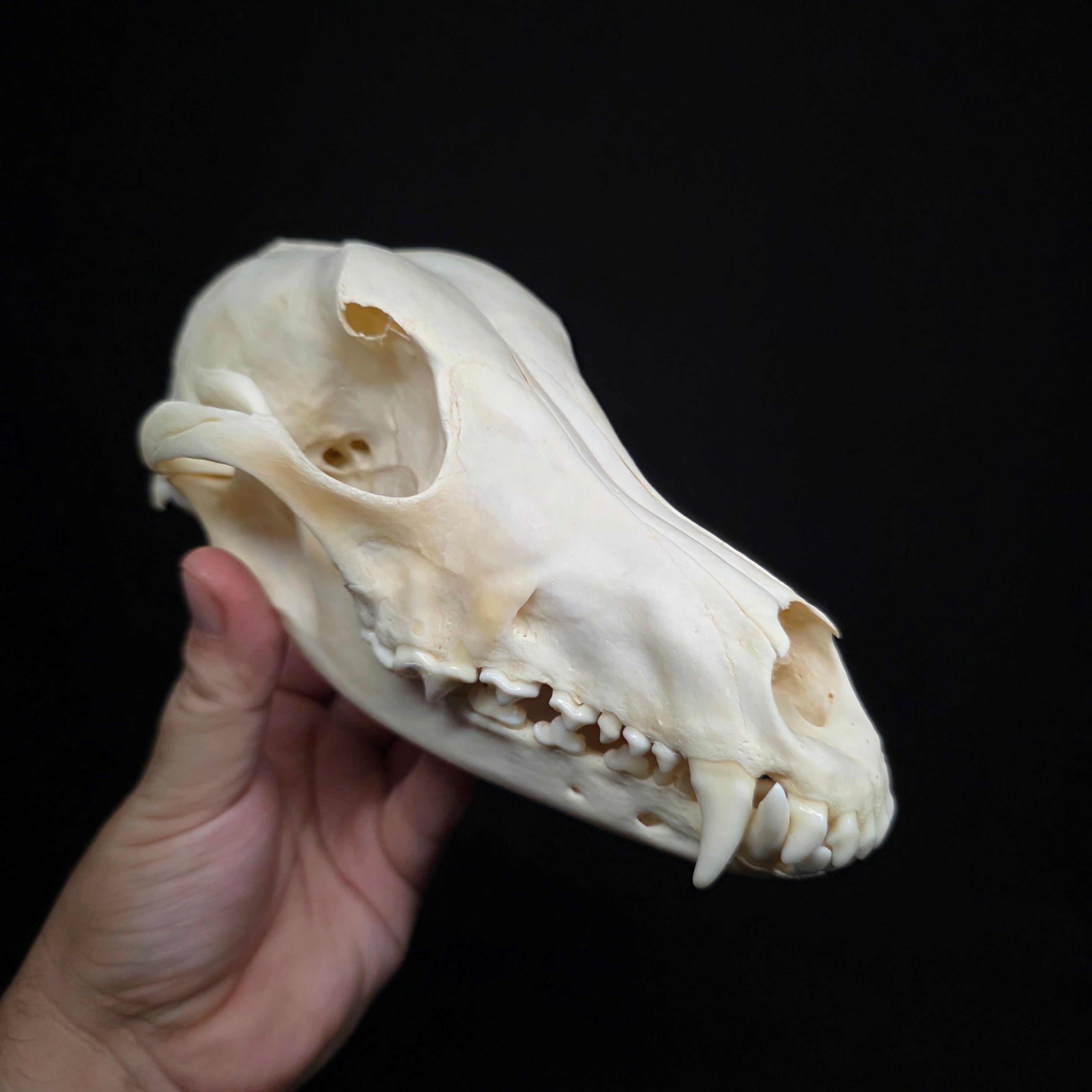 There is some damage to it's right eyebrow. I can't tell if it's pre or post mortem, but I've included a couple of close up pictures. Other than that, it's dentition is absolutely perfect, has nasal turbinates, and that really distinguishable long/narrow snout