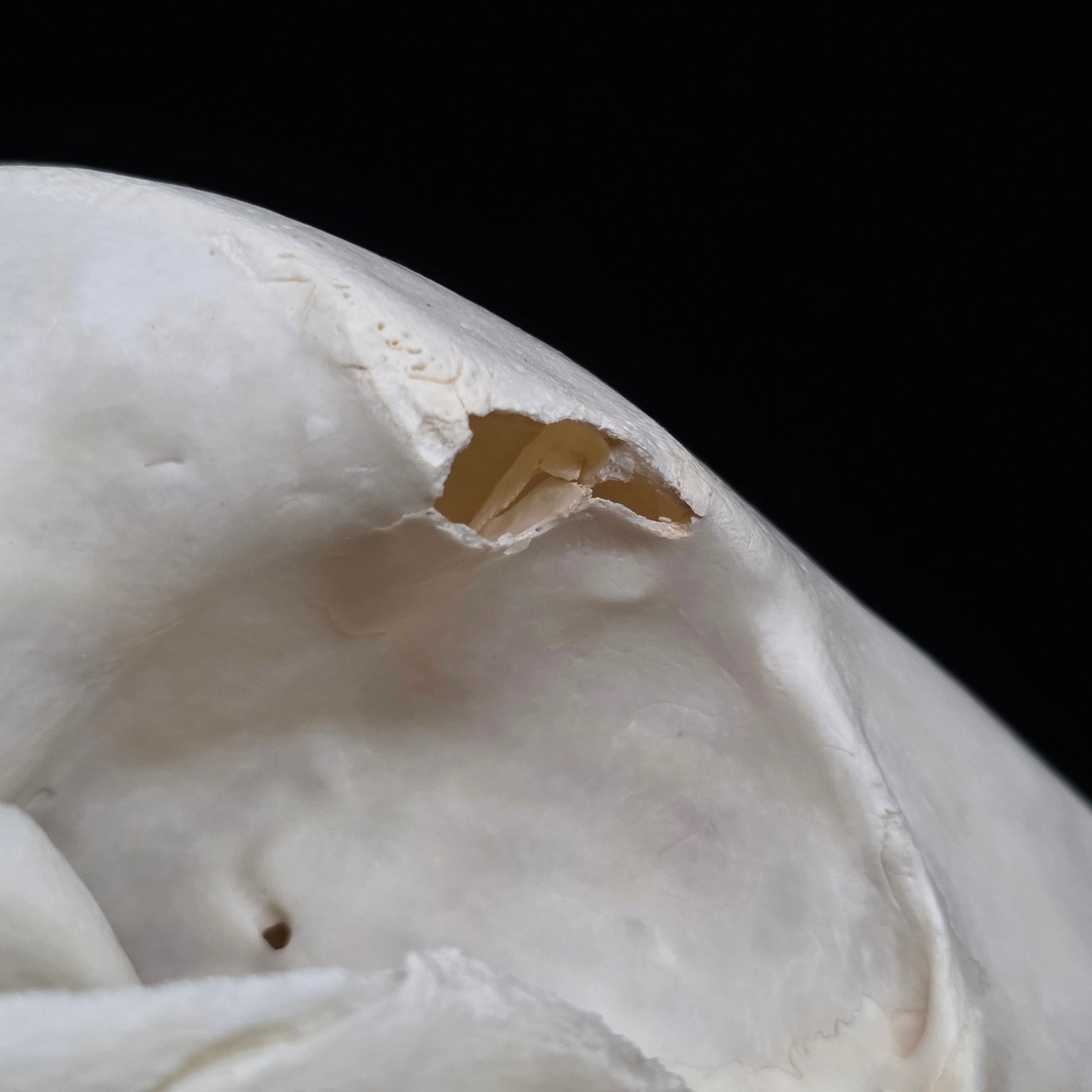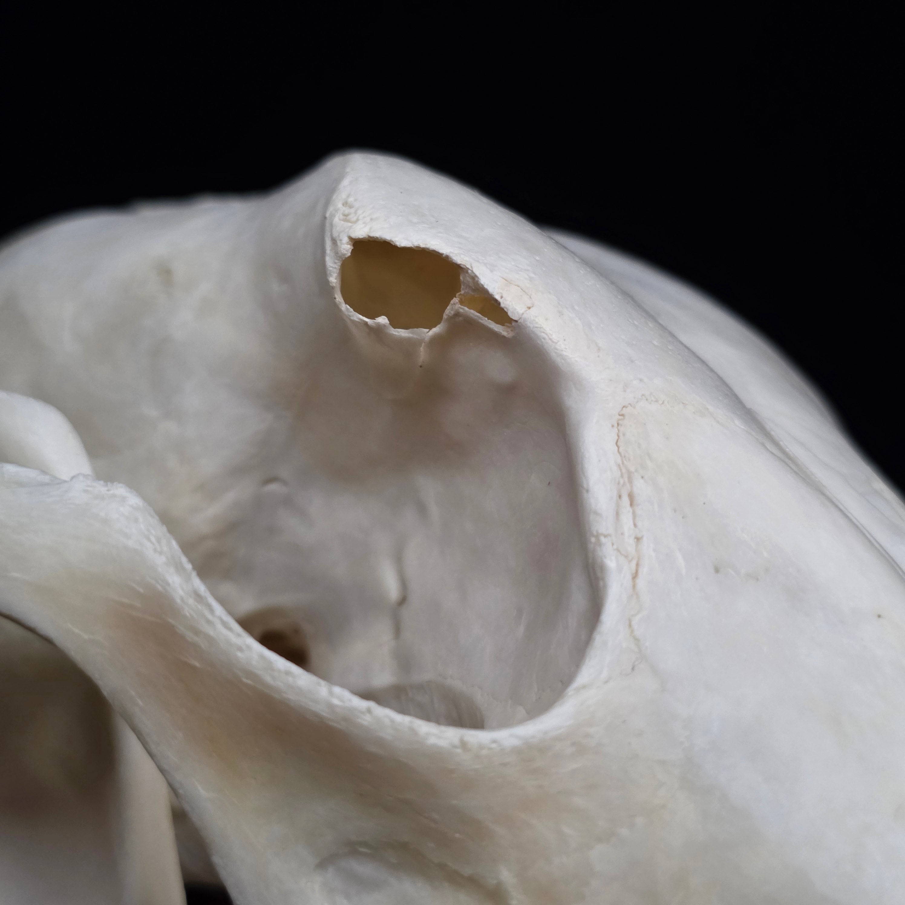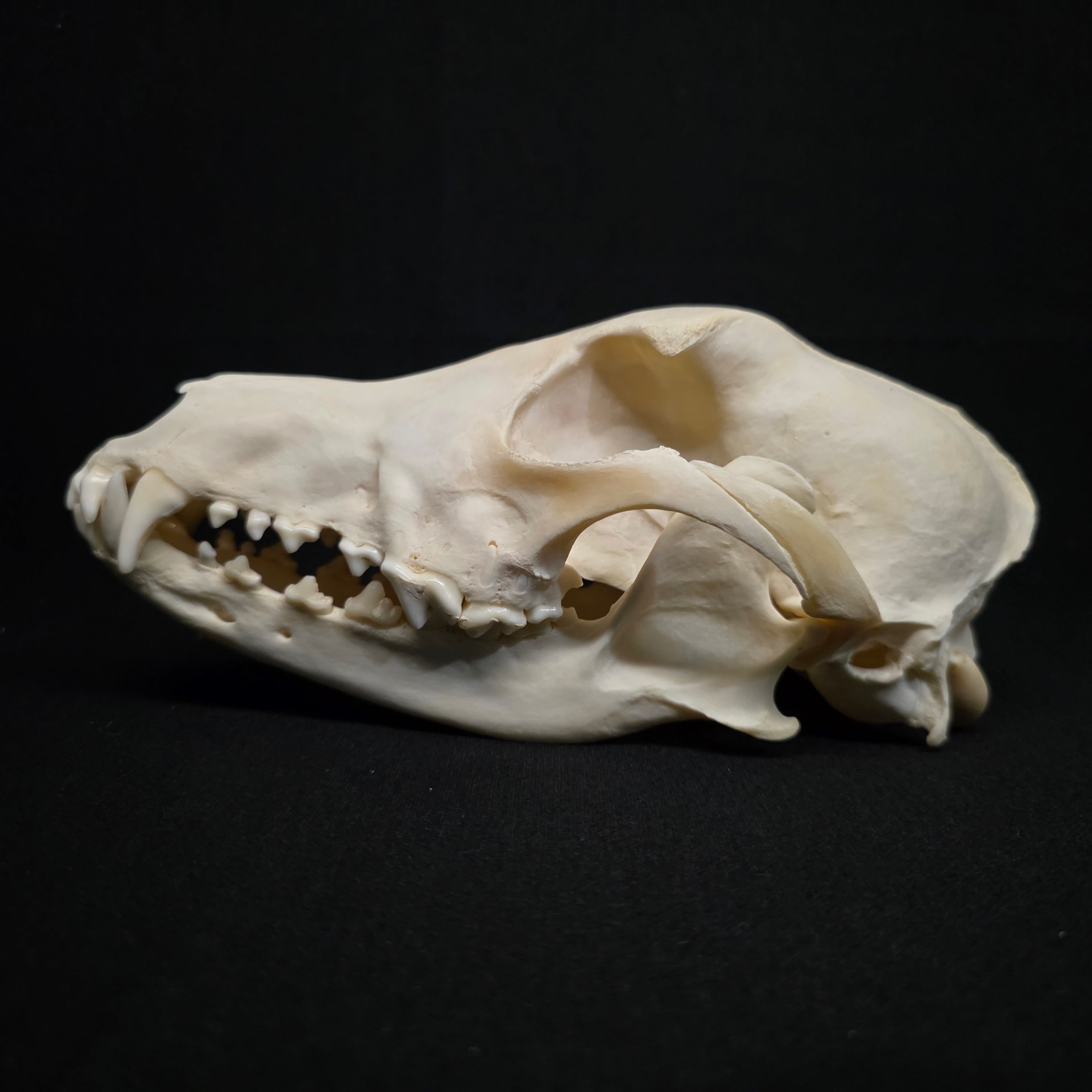 There is some damage to it's right eyebrow. I can't tell if it's pre or post mortem, but I've included a couple of close up pictures. Other than that, it's dentition is absolutely perfect, has nasal turbinates, and that really distinguishable long/narrow snout