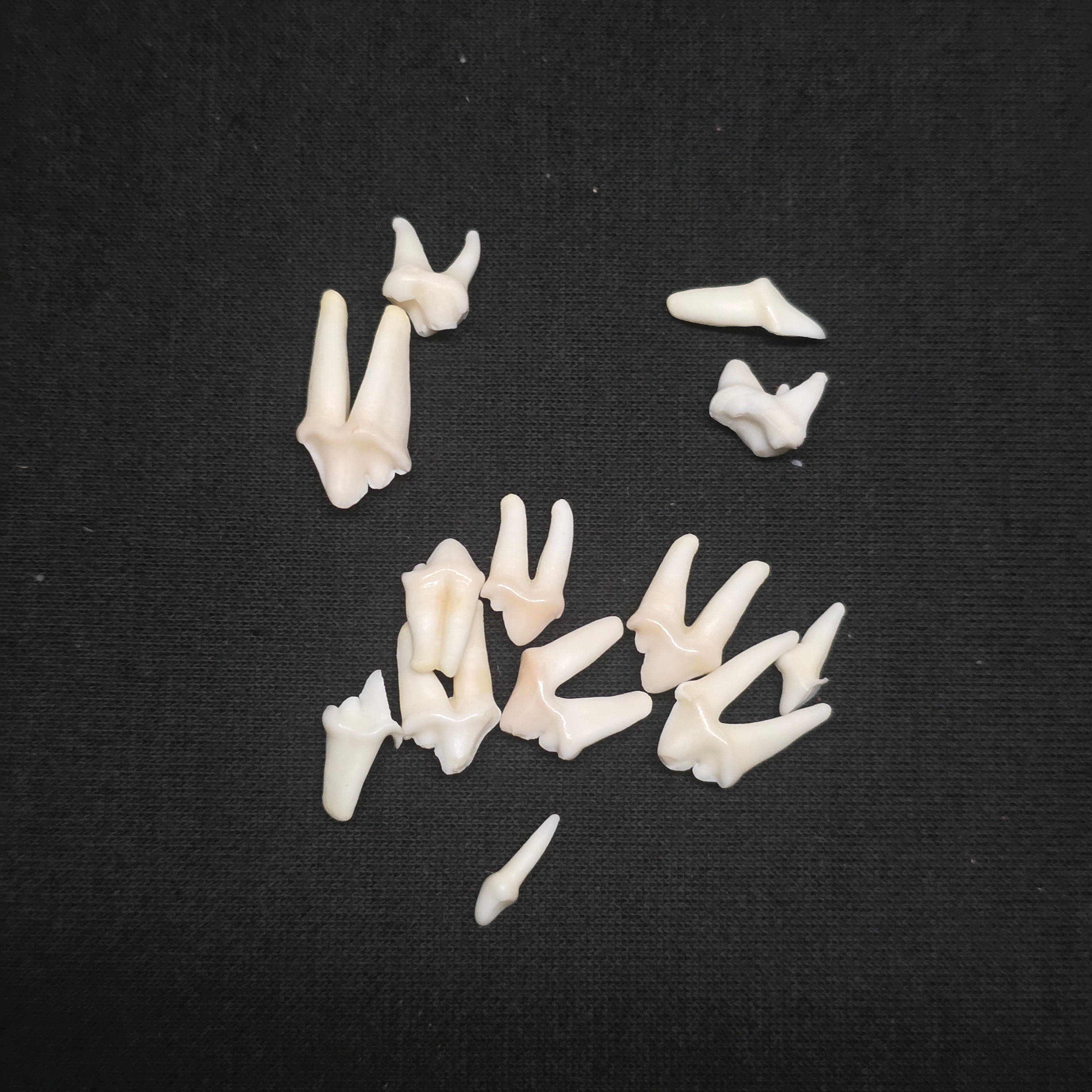 These are real, cleaned domestic dog teeth from broken/incomplete skulls. The teeth are from mixed German Shepherd breeds. Note some teeth so have cracks and chips on them.